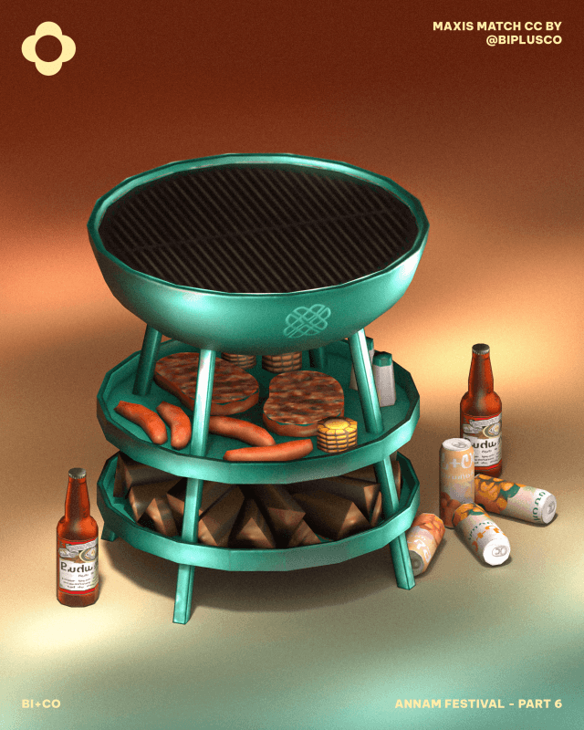 BI+CO Annam Festival – Part 6 Ready to Sizzle & Serve? Kick off the New Year with an outdoor BBQ vibe! Featuring our new functional grill! 🥩 🥓 All item is Base Game Compatible (BGC) Sizzle Station | 9 Swatches Feast Afterglow | 5 Swatches Sundowner | 5 Swatches