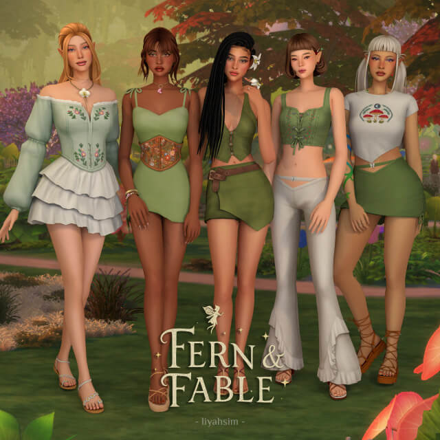 Fern & Fable Collection Step into an enchanted forest where magic and nature intertwine. Inspired by fairycore aesthetics, this collection is designed for both fairies and ordinary Sims who want to add a subtle, romantic touch of fantasy to their everyday style. 🌿 This collection includes 8 pieces: soft silhouettes, embroidered details, and earthy tones that bring the essence of the forest to life—perfect for Sims who dream of whimsical adventures while keeping things wearable and chic. 🍄 Whether your Sims have wings or not, let them dress like they belong to a fairy tale.