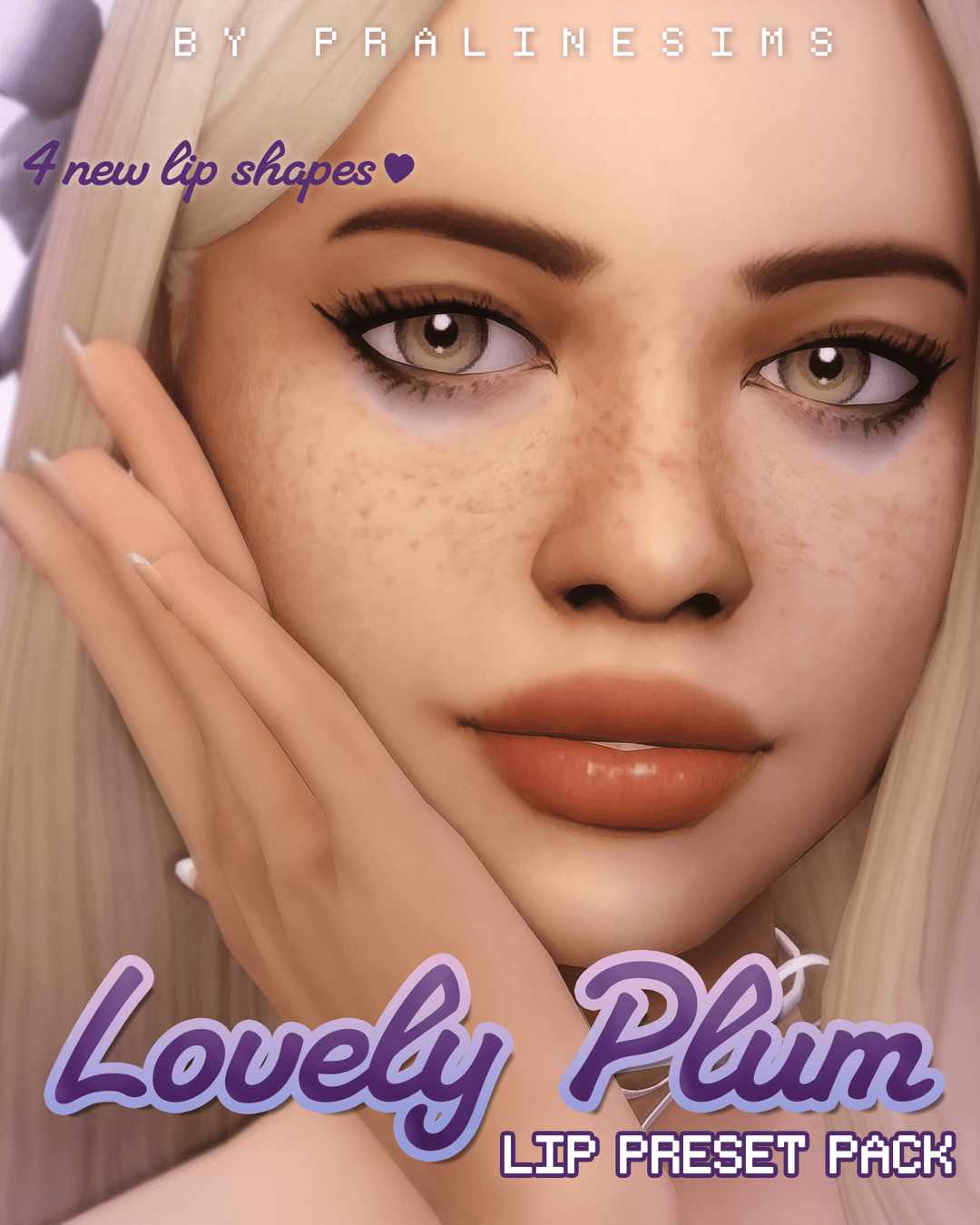 Plump like a plum! 💜 Super new category for me, yay! I’ve made presets for the first time ever, and here they are. A pack of 4 brand-new lip shapes. Perfect for a fresh ‘tox look, or simply for naturally fuller lips. Enjoy 🫶 Base game compatible. 4 different presets. Under lips category (face/genetics, NOT makeup). All with custom thumbnails. For fem frame, teen-elder. For all humans & human appearing occults. Edit with detail mode for more options & individuality.
