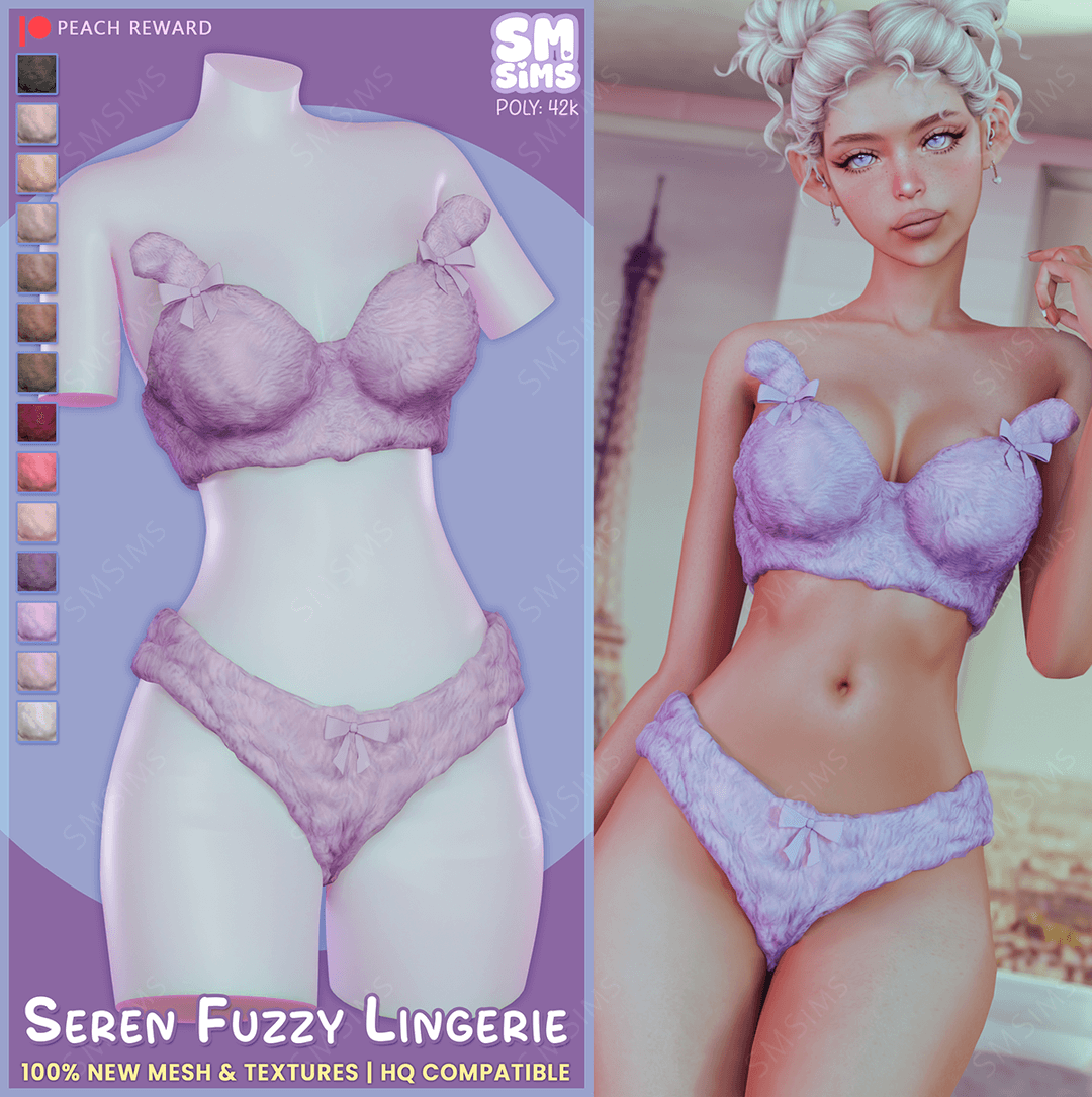 Seren Fuzzy Lingerie💜 EVE V10 base 💜 Made specifically for TS4 💜 Compatible with Sejian’s Custom CAS tag mod Mesh: all LODs, 100% new, poly 42k Textures: 100% new, HQ enabled, norms incl., amended shadow maps for EA skin bug